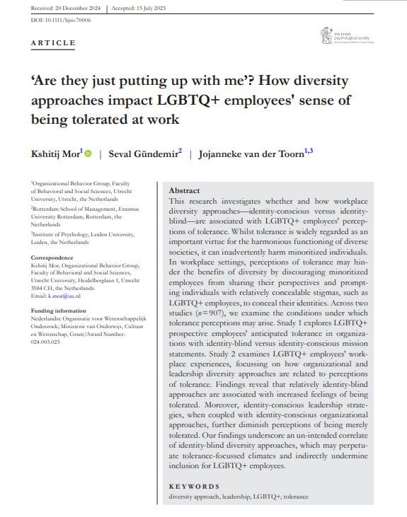 Congratulations to SCOOP PhD researcher Kshitij Mor for his latest article with colleagues Seval Gündemir and Jojanneke van der Toorn. “‘Are they just putting up with me’? How diversity approaches impact LGBTQ+ employees’ sense of being tolerated at work” (published by the British Journal of Social Psychology), explores how merely being “tolerated” at work can undermine inclusion and discourage authentic contributions by LGBTQ+ people. If a workplace’s diversity approach is “identity blind” rather than “identity conscious”, minoritized individuals can be inadvertently harmed. Kshitij and his colleagues found that when organisational leaders adopt an identity-conscious approach, LGBTG+ employees' feelings of being only tolerated are significantly reduced.